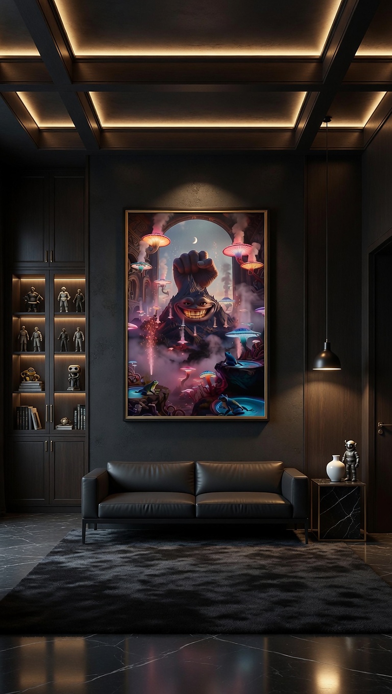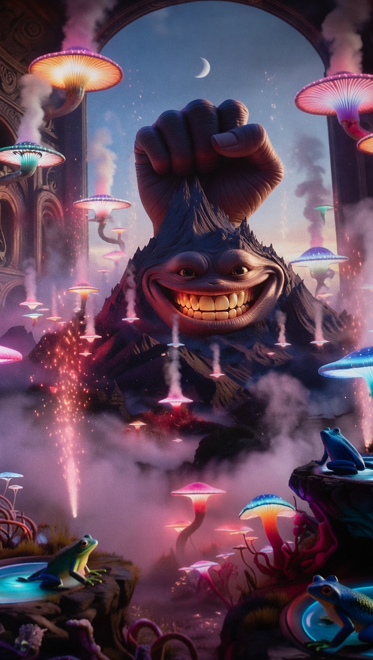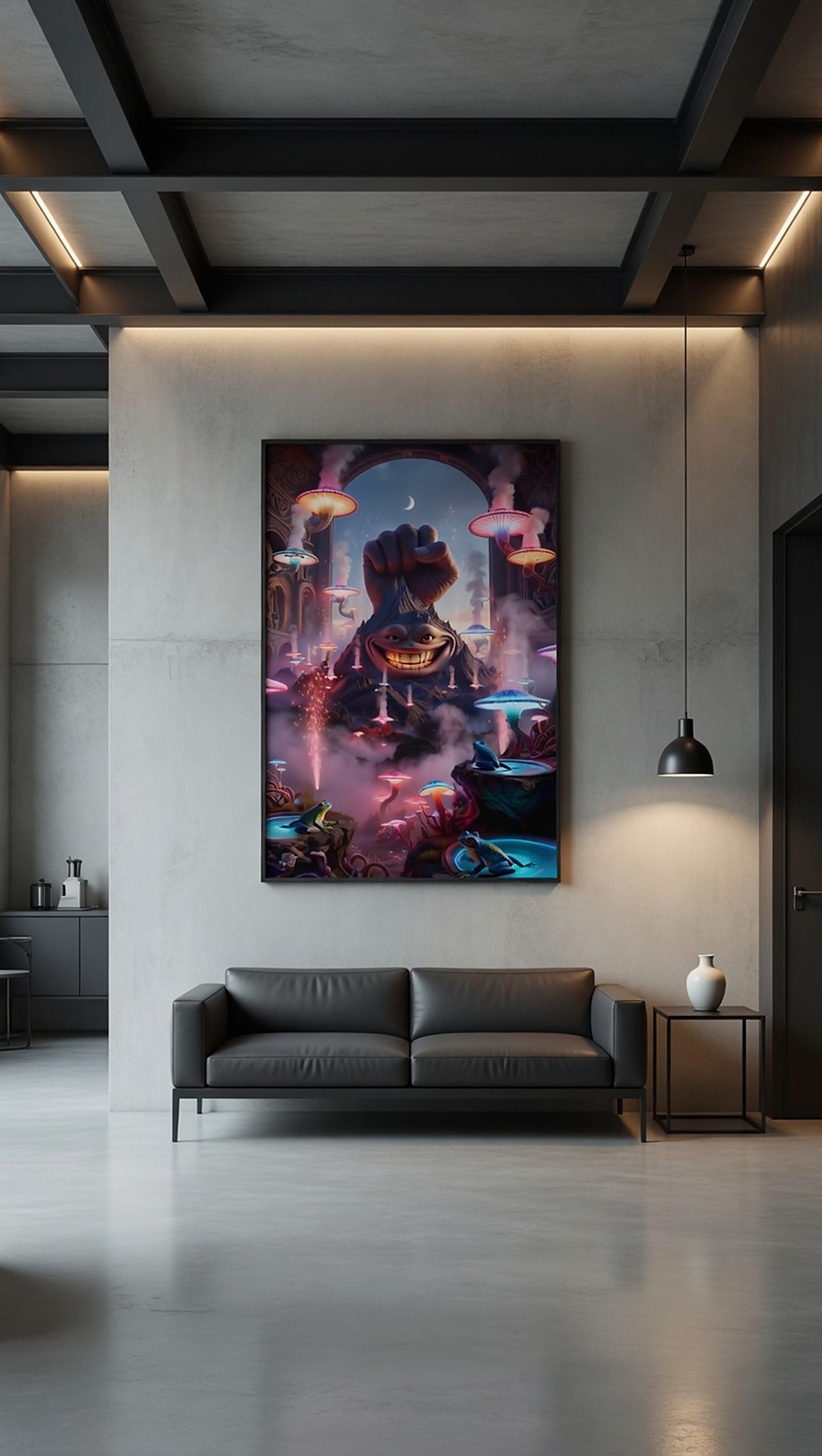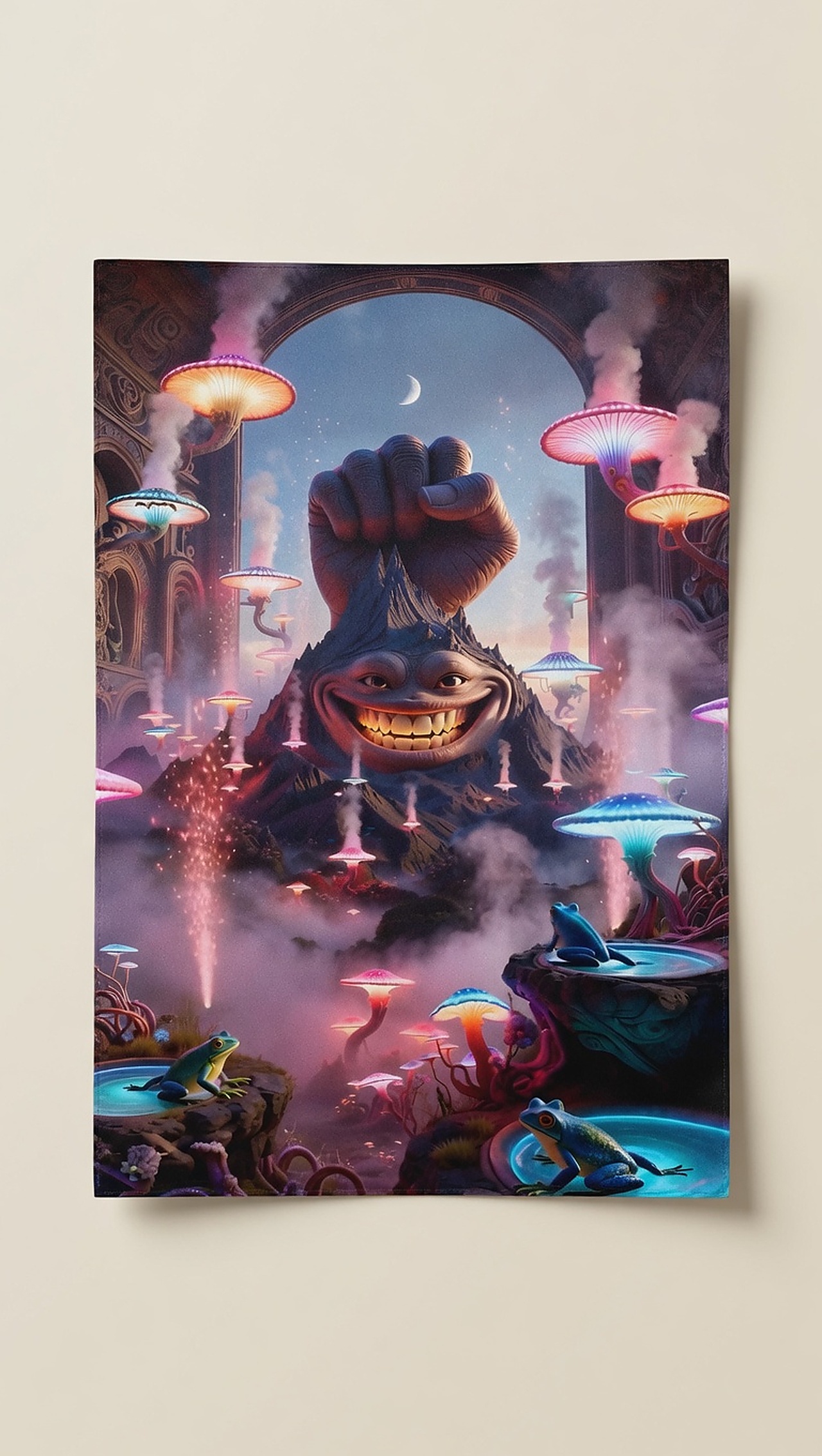 A towering grin, a raised fist, and a throne of light. Signal of Dominion captures the moment power becomes prophecy. Printed from an original Quetopia world, this piece is designed for collectors of surreal, psychedelic, and cosmic wall art.