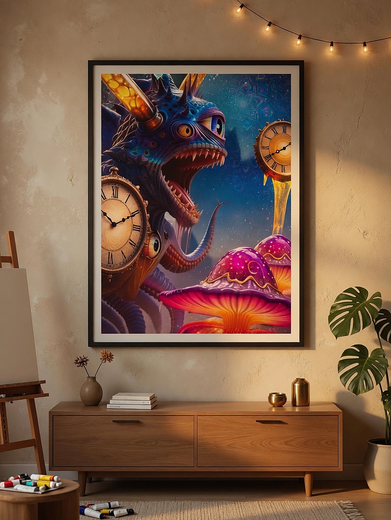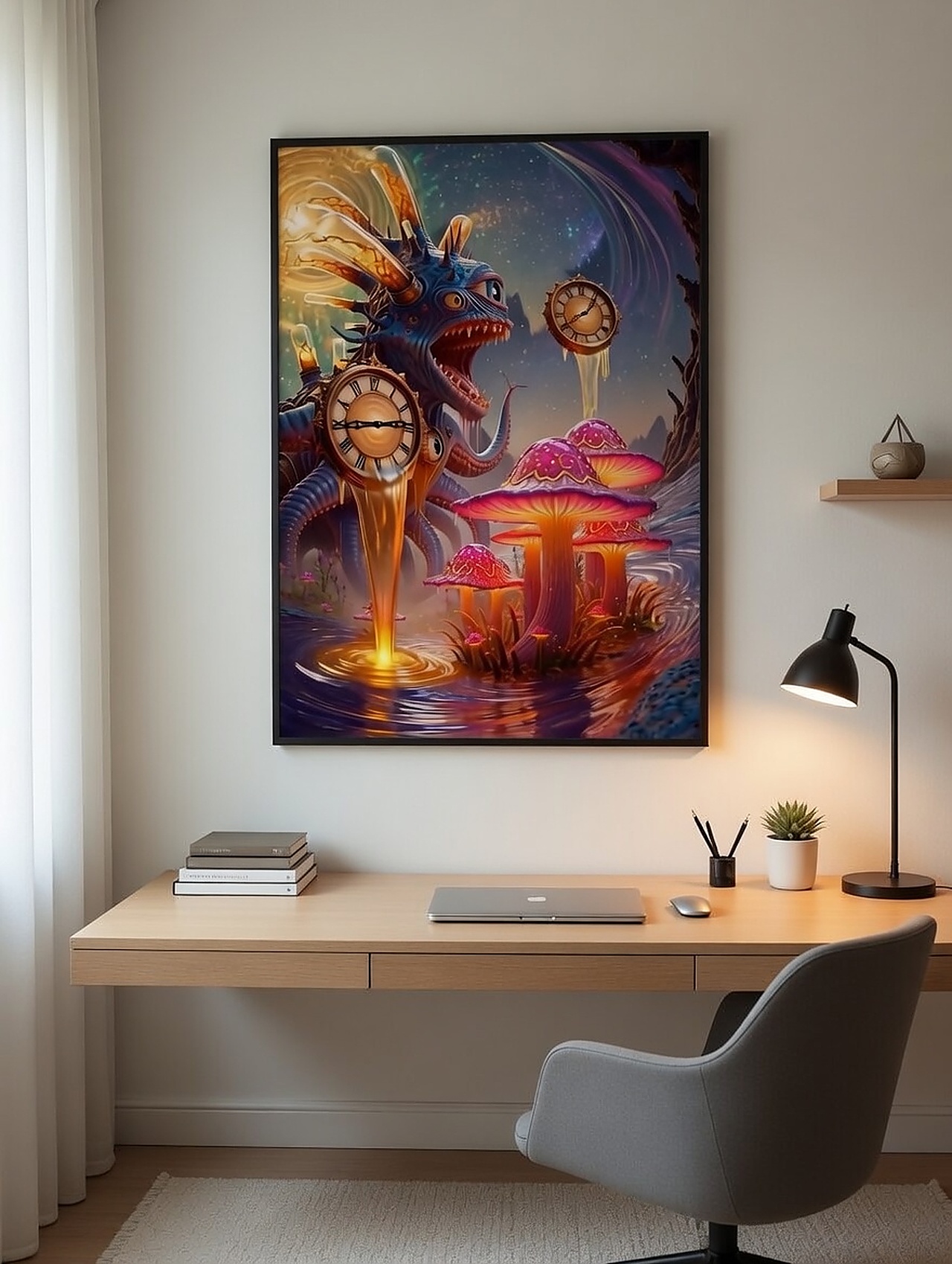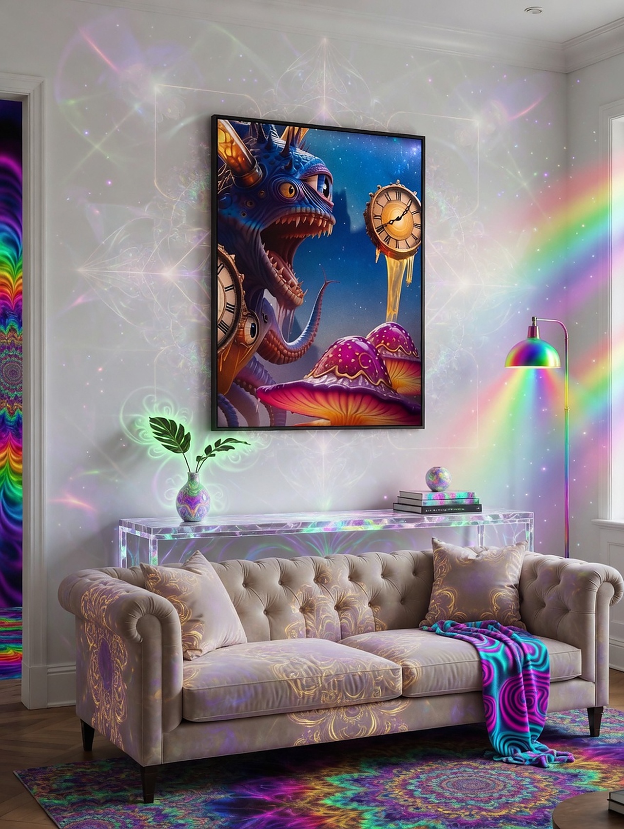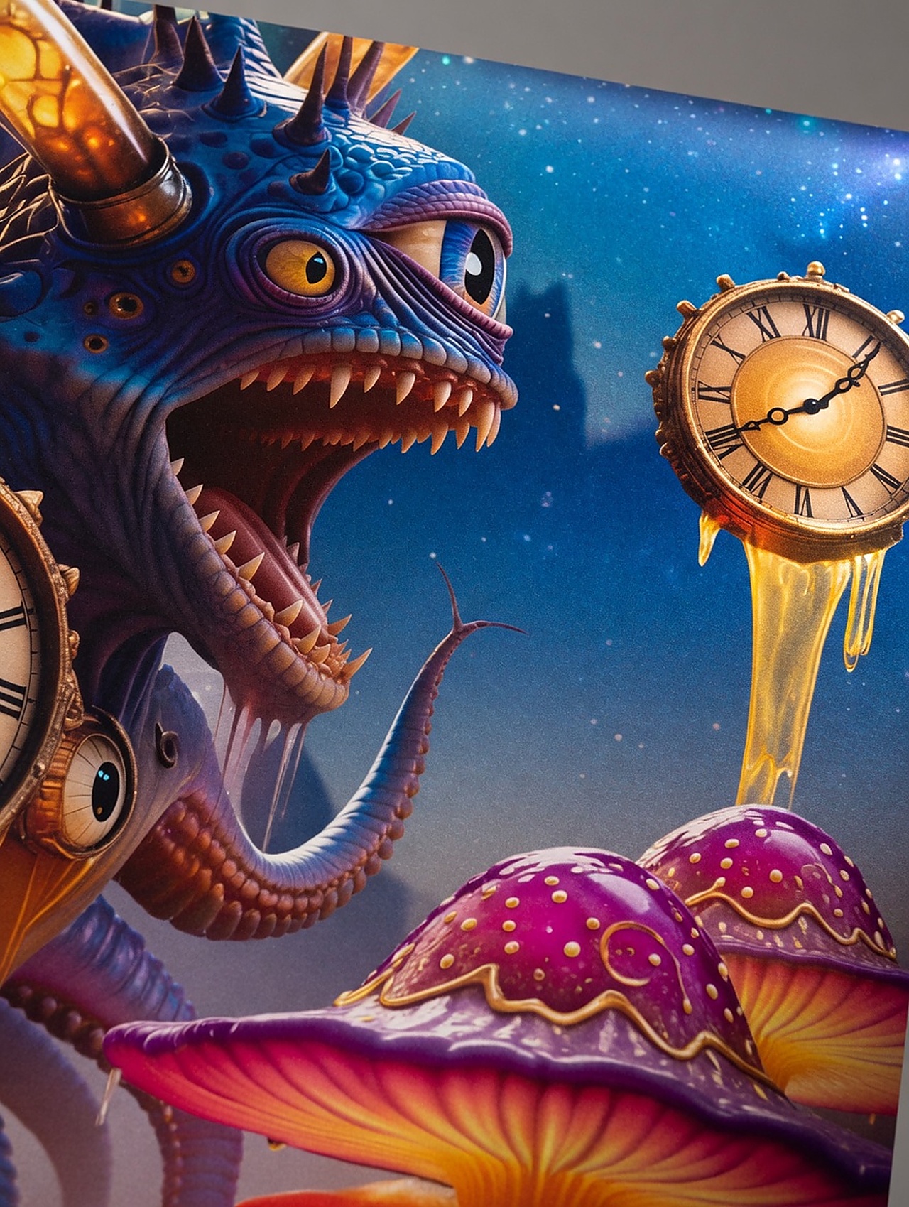 Time breaks open in glowing rivers beneath impossible clocks. Time Leak is a bright collision of wonder, distortion, and surreal flow. A strong statement piece from the Quetopian universe.